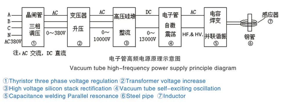 ပုံမှန်စက်မှုလုပ်ငန်း AC (တရုတ်နိုင်ငံရှိ သုံးဆင့်လေးကြိုး 380V/50HZ) ကို thyristor AC ဗို့အားထိန်းညှိစနစ်ဖြင့် 0 မှ 380V (ကြိမ်နှုန်းမပြောင်းလဲ) ချိန်ညှိနိုင်သော AC အဖြစ်သို့ ပြောင်းလဲပြီးနောက် မြင့်မားသောဗို့အား (ကြိမ်နှုန်းမပြောင်းလဲသော) ထောင်ပေါင်းများစွာသော ဗို့အားနှင့် rectifier ဖြင့် 10000V နီးပါးအထိ မြင့်မားသော circuit ကို rectified၊ ဗို့အား DC၊ ထို့နောက် လေဟာနယ်ပြွန်ဖြင့် HF နှင့် HV လျှပ်စီးကြောင်းသို့ လည်ပတ်ကာ၊ ထို့နောက် လည်ပတ်စီးဆင်းမှုကို ချဲ့ထွင်ရန်အတွက် LC parallel resonance မှတဆင့်၊ နှင့် ဗို့အားလျော့ချပေးပြီးနောက် သံမဏိပိုက်များနှင့် အခြား workpieces များ စသည်တို့ကို အပူပေးရန်အတွက် အသုံးပြုသော inductor သို့ ဗို့အားလျှော့ချပေးသည်။